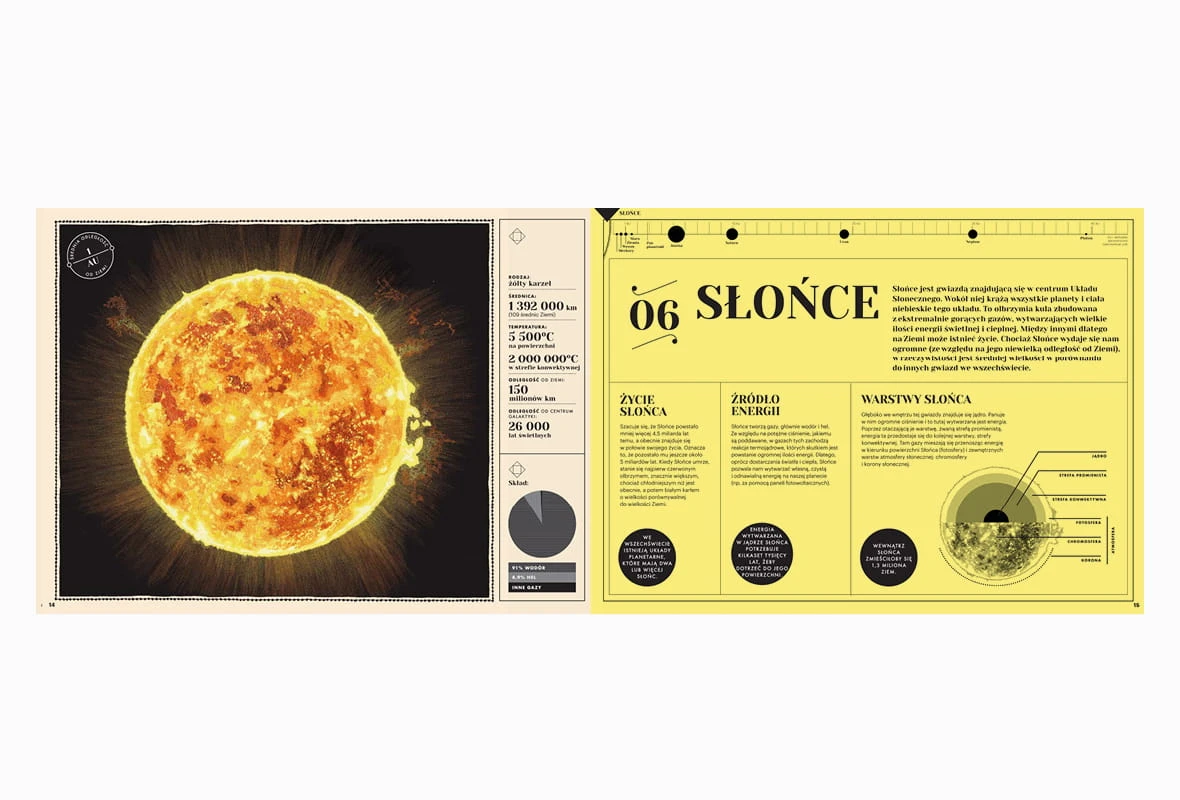 Ziemia jest maleńkim punkcikiem krążącym wokół Słońca, ogromnej gwiazdy znajdującej się w centrum naszego układu planetarnego. Grawitacja Słońca przyciąga siedem siostrzanych planet Ziemi. Każda z nich jest inna: Wenus to gorąca pustynia, Marsa pokrywa rdzawoczerwony pył, wokół Jowisza kłębią się chmury, niezwykłe pierścienie otaczają Saturna, Uran jest ogromną kulą lodową, podobnie jak niebieskozielony gigantyczny Neptun. Pozwólcie się zabrać w fascynującą podróż po cudownych i nieznanych zakątkach Układu Słonecznego.