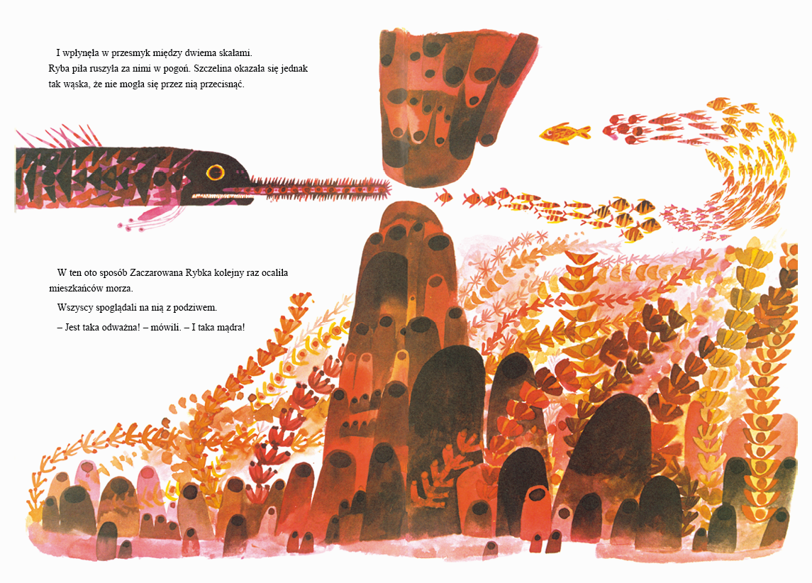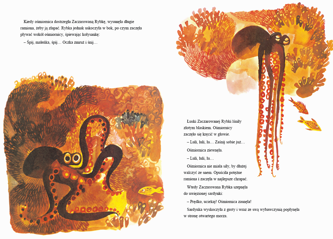 „W muzeum był – i wciąż jeszcze jest – pewien obraz, który bardzo podobał się wszystkim dzieciom. Przedstawiał złotą rybkę namalowaną na ciemnogranatowym tle. Za każdym razem, kiedy dzieci odwiedzały muzeum, przystawały przed portretem Zaczarowanej Rybki – jak ją nazwały – i wpatrywały się w niego z niesłabnącym zachwytem”.